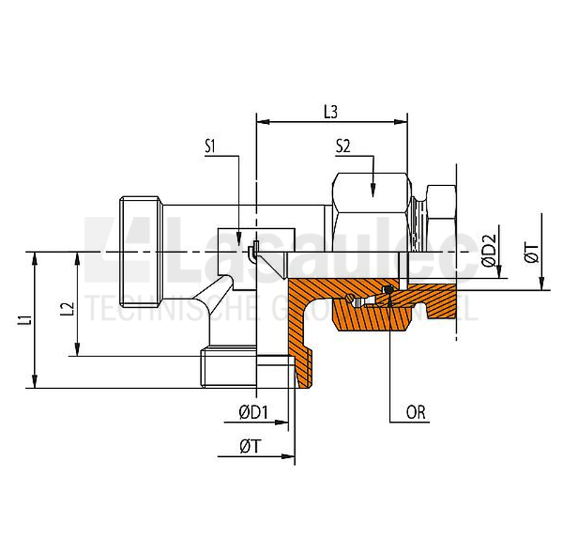 Body ten behoeve van L-koppeling. Knel x knel x wartelmoer. NBR O-ring. Instelbare L-koppeling. Elektrolytisch verzinkt.