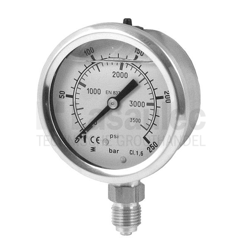 Manometer onderaansluiting 1/4" BSPP Kl. 1.6 Glycerine gevuld. Werktemperatuur: 0°C - +60°C. RVS-316.
