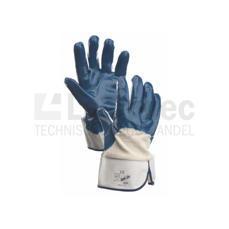 Handschoen voorzien van 100% katoenen interlock drager, gedipte blauwe nitril knokkelcoating en 7 cm lange kap. De handschoen biedt een zeer goede droge grip en is geschikt voor werkzaamheden met olie.