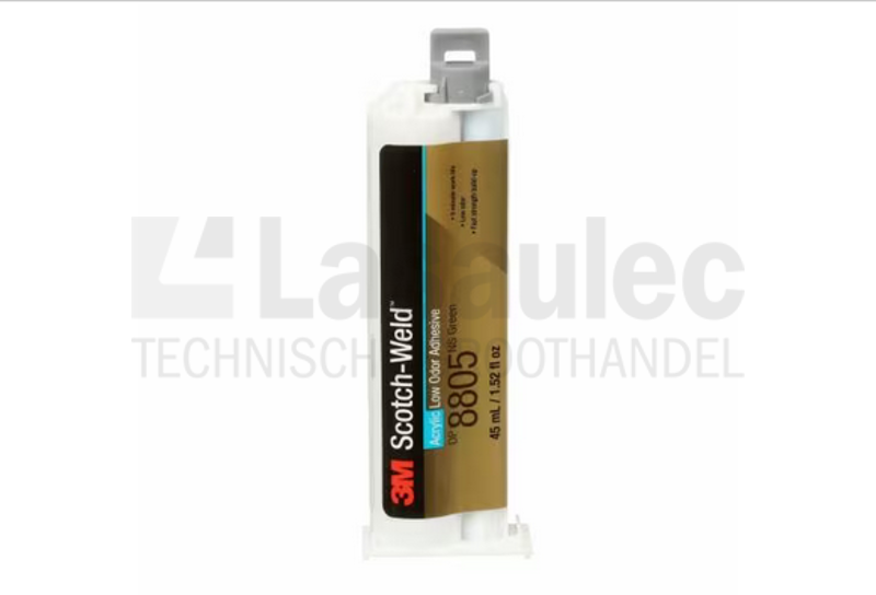 3M™ Scotch-Weld™Structurele Lijm 8805NS is een vertaaide 2-componenten acrylaatlijm met lage geur heeft een 1:10 mengverhouding en een 3-5 minuten opentijd om het werkstuk te positioneren. Binnen de 10 minuten wordt reeds een behoorlijke afschuifsterkte behaald, dubbel zo snel als de