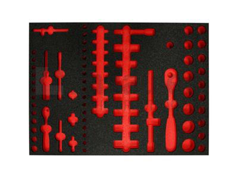 De inlay is vervaardigd uit stevig en slijtvast materiaal dat bestand is tegen intensief dagelijks gebruik. Dankzij de nauwkeurig gevormde uitsparingen ligt elk stuk gereedschap stevig en veilig waardoor beschadiging wordt voorkomen en alles altijd direct terug te vinden is.