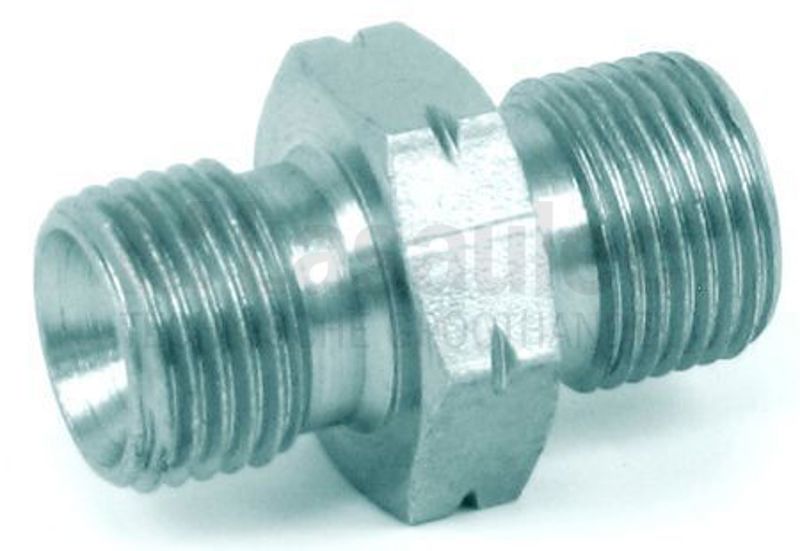 Metrische buitendraad x BSPP buitendraad, met zeskant, vlakke dichtingsrand en beide zijden inwendig 60° afgeschuind. Elektrolytisch verzinkt.