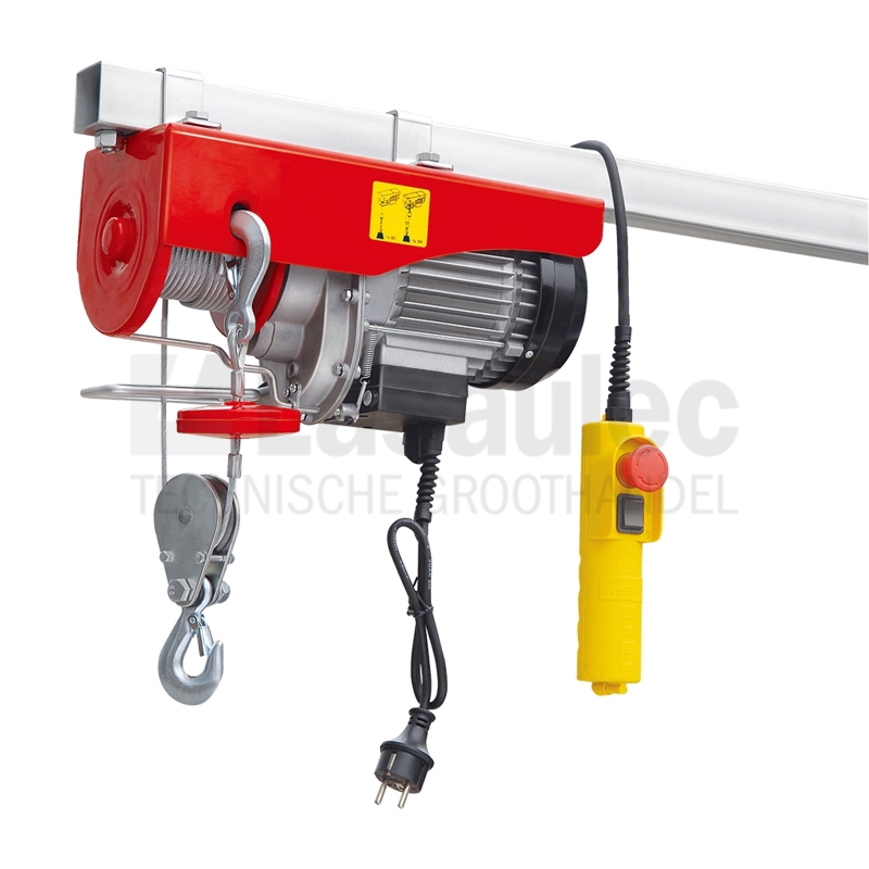 Elektrische takel voorzien van een-knopsbediening met eindschakelaar, uitgerust met noodstop en dodemansknop en Tuv, GS en CE-keur.