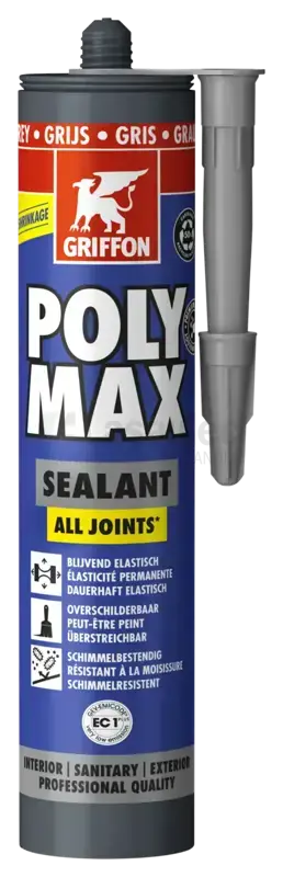 Griffon Poly Max® Sealant is een multifunctionele afdichtingskit van premium kwaliteit voor afdichtingstoepassingen binnen, buiten en in sanitaire ruimtes. Goede hechting op vele bouwmaterialen zoals beton, steen, composiet, metaal, keramische tegels, glas, (geverfd) hout en diverse kunststoffen.