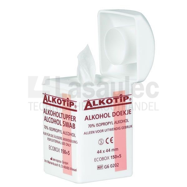 Deze alcoholdoekjes worden veel gebruikt voor het desinfecteren van de huid. Bijvoorbeeld voordat er een injectie plaatsvindt. De doekjes zijn pluisvrij en gedrenkt in 70% isopropylalcohol. De alcoholdoekjes zitten verpakt in een dispenserbox met sluitdeksel welke verdamping voorkomt. De afmeting van een doekje is 44 x 44 mm.