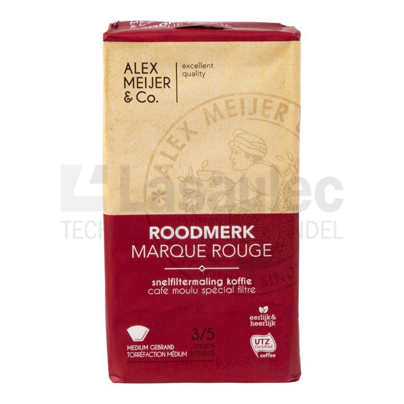Alex Meijer & Co. excellent quality. Roodmerk snelfiltermaling koffie. Medium gebrand 3/5 sterkte. Voor onze Alex Meijer Roodmerk koffiemelange hebben we een evenwichtige verdeling van Arabica en Robusta bonen gebruikt. Hierdoor krijgt deze koffie een vol en rond aroma. Geliefd bij veel koffiedrinkers.