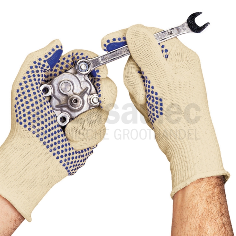 Handschoen met tricot manchet gemaakt van met polyester bekleed katoen en voorzien van PVC noppen voor een goede grip. Mechanische bescherming bij lichte toepassingen.