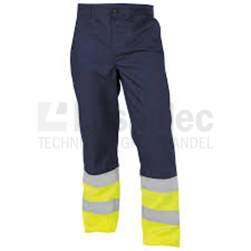 Werkbroek, high-vis, van polyester-katoen met reflectie band 60 mm breed. Verder uitgevoerd met verstelbare rugelastiek, jeansknoop en drukknoopsluiting en twee steekzakken, een meterzak en een versterkte achterzak. Brede zoom van 5 cm voor extra verlengen.
