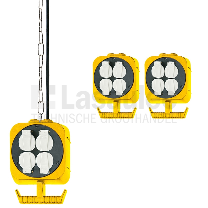 Op de gewenste werkhoogte ophangbare stroomverdeler. Energieblok voorzien van stopcontacten 230 V / 16 A, huis uit slagvaste kunststof met grote gereedschaphaak, 3 meter stabiele verzinkte stalen ketting, 5 meter aansluitkabel H05VVF 3G1,5 en stekker.
