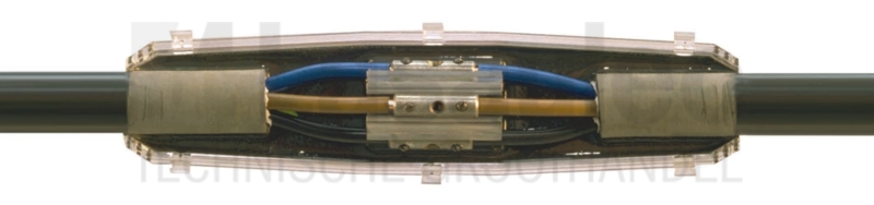Universeel verwerkbare verbindingsmof met schroef verbinders voor het verbinden van laagspannings-, telecom- en signaal kabels.