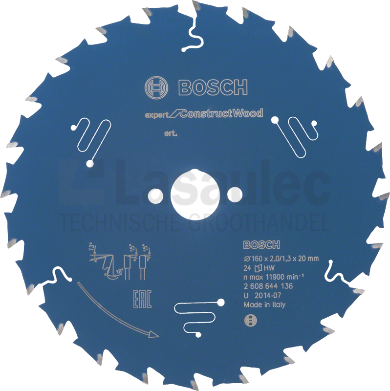 Het Expert for Construct Wood cirkelzaagblad is zeer slijtvast bij het zagen in bouwhout. De unieke, extra harde Microteq-tanden zijn in-house geproduceerd door Bosch uit zeer duurzame carbidekorrels voor grote zaagprestaties en lange levensduur. Dit wordt verder ondersteund door de combinatie van speciale tandopstelling van het blad en de brede vertanding. Voorts zorgen de speciaal ontworpen trillingsdempende sleuven voor moeiteloos zagen, met aanmerkelijk minder lawaai en aanzienlijk verminderde trillingen. Bovendien is het Expert for Construct Wood cirkelzaagblad voorzien van een b