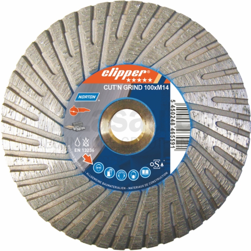 Multi functioneel diamantblad voor zagen en slijpen van bouwmaterialen. Een gesinterde Turbo vorm om snelle materiaal afname en en mooie finish te bereiken tijdens zagen en slijpen. Norton Cut'n'Grind kan voor dezelfde toepassingen gebruikt worden als de diamantbladen en komschijven. De schijf is uitgerust met een aluminium flens met M14 aansluiting.