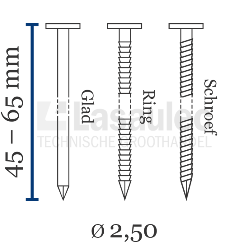 A504906 | 2,5 x 50 mm | pallet a 360.000 stuks | - | € 3385,85 | Huidige variant Bekijken | |