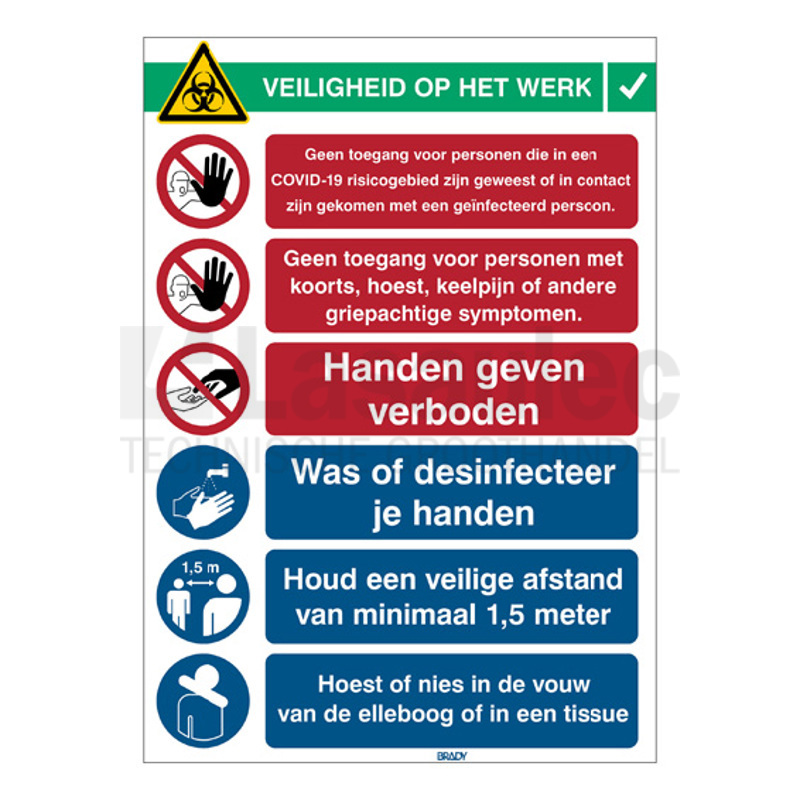 Veiligheidssticker voor bij de receptie met regels en pictogrammen tegen Corona.
