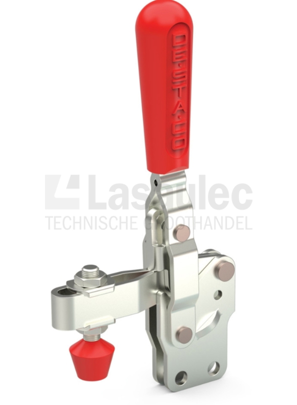 Verticaalspanner voor positioneren, klemmen, spannen en sluiten. Voorzien van rode oliebestendige antislip handgreep, alle delen zijn standaard verzinkt, oliebestendige drukvoet en veiligheidstussenstuk beschermt uw hand.