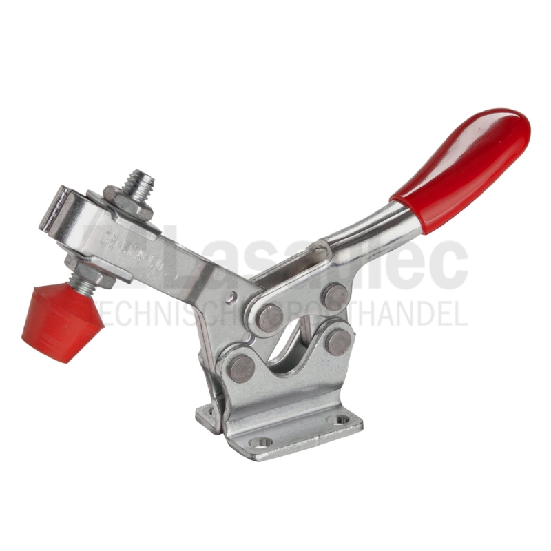 Snelspanklem voor positioneren, klemmen, spannen en sluiten. Voorzien van rode oliebestendige antislip handgreep, alle delen zijn standaard verzinkt, oliebestendige drukvoet en veiligheidstussenstuk beschermt uw hand.