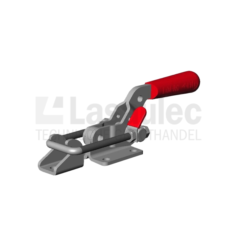 Bij de sluitspanner wordt eerst de spanbeugel (U-beugel) over de tegenhaak gelegd en aansluitend door neerdrukken van de handgreep door het dode punt gespannen.