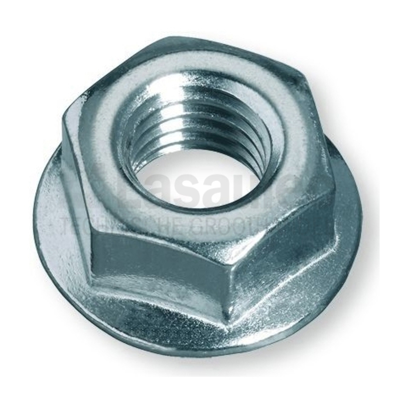 Flensmoer voorzien van zeskant aansluiting en metrische schroefdraad.