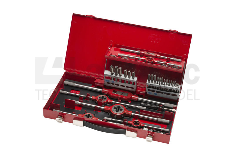 Set draadsnij-gereedschappen met Tappen, Snijplaten, Wringijzers en Snijplaathouders (snijramen) in stalen koffer.