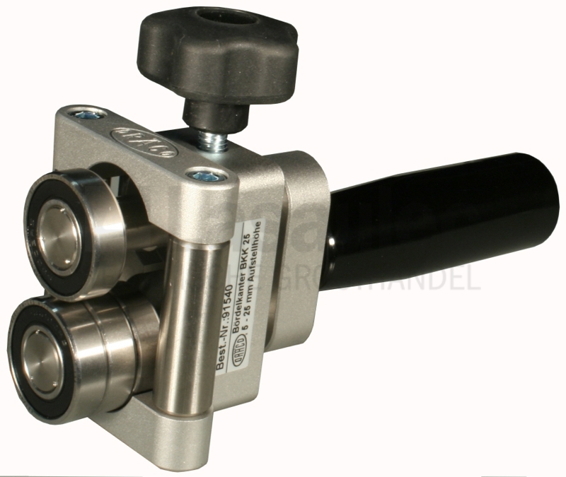 Heel simpel. De gewenste zethoogte instellen en het materiaal tussen de aanslagrollen schuiven. De enkele aanslagrol/kogellager is boven. Nu de BKK door het materiaal voor en terug bewegen