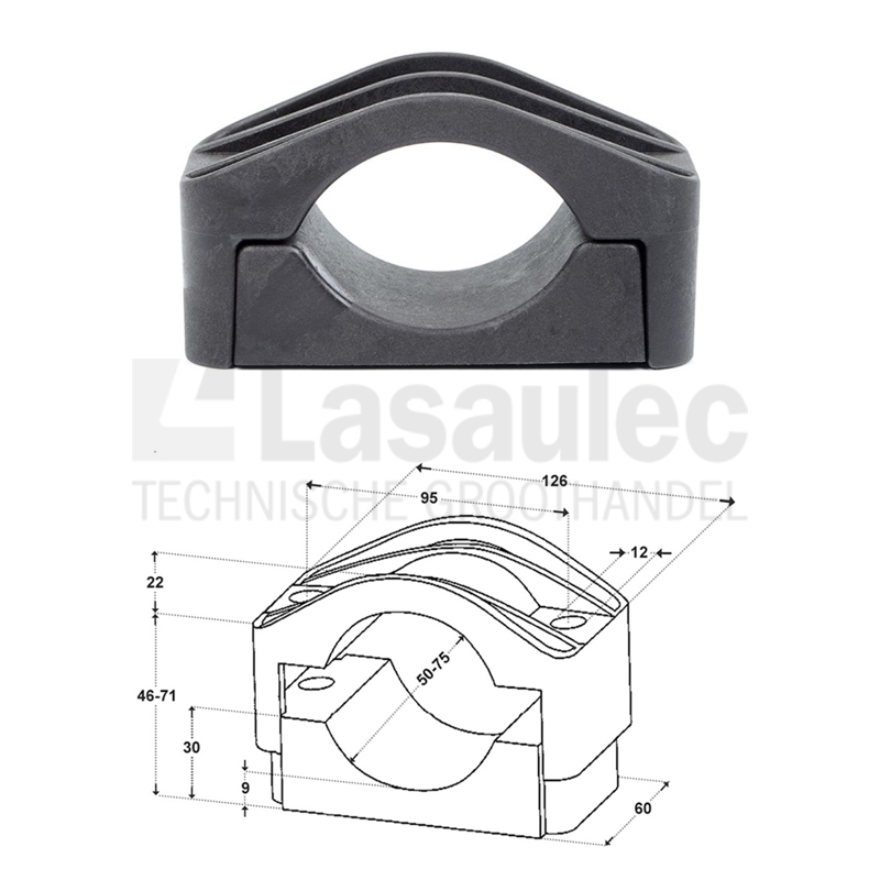 Kabelklem van glasvezelverstrekt PA voor kabel. Bestand tegen enorme kortsluitstromen, vlamdovend, -40 - 125gr C. Geen oxcidatie/corrosie, geen scherpe hoeken.
