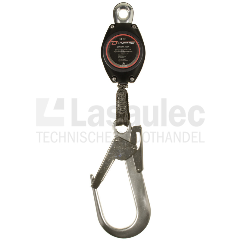 Valstopblok met een aluminium behuizing en een 25 mm breed Dyneema band (snijbestendig), lengte 3,4 meter. Het blok wordt geleverd met een gecertificeerde haak (in deze combinatie een aluminium uitvoering) en heeft geen externe valdemper. Getest tot 140 kilogram.