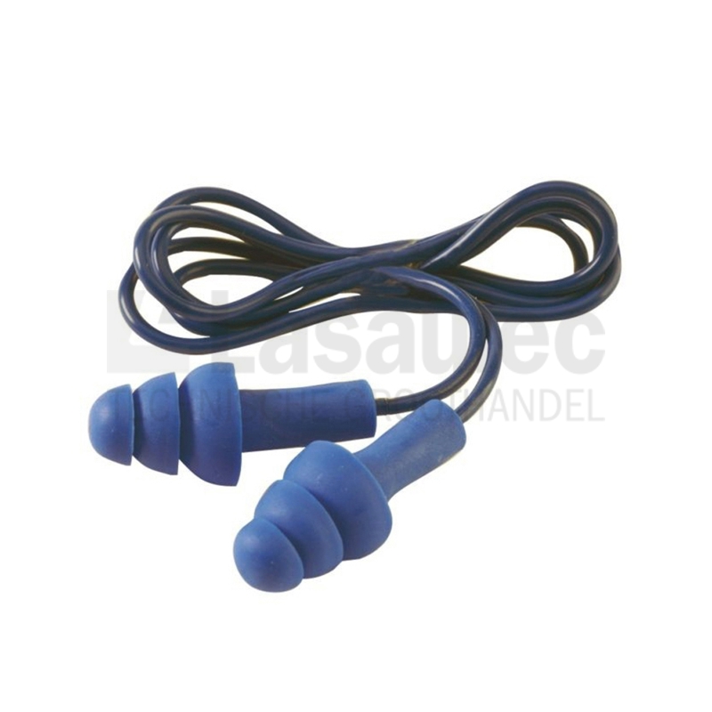 Detecteerbare, herbruikbare en vochtbestendige oordoppen voorzien van koord, geschikt voor de voedselindustrie.