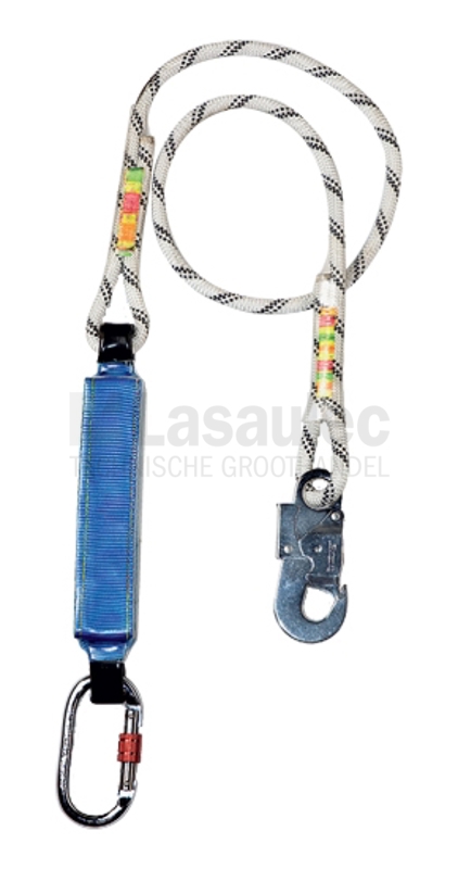 Veiligheidslijn voorzien van valdemper, welke de kracht van de val absorbeert en daardoor een letselbeperkende werking heeft, polyamide kernmantellijn en haken type 223 + 122.