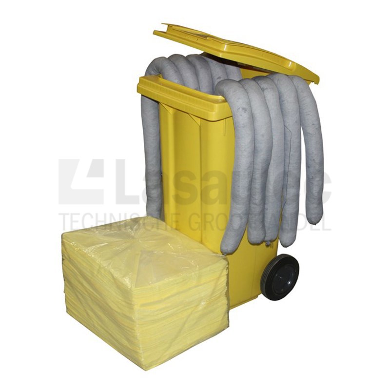 Een gele, verrijdbare kliko van circa 130 liter gevuld met universeel absorptiemateriaal.