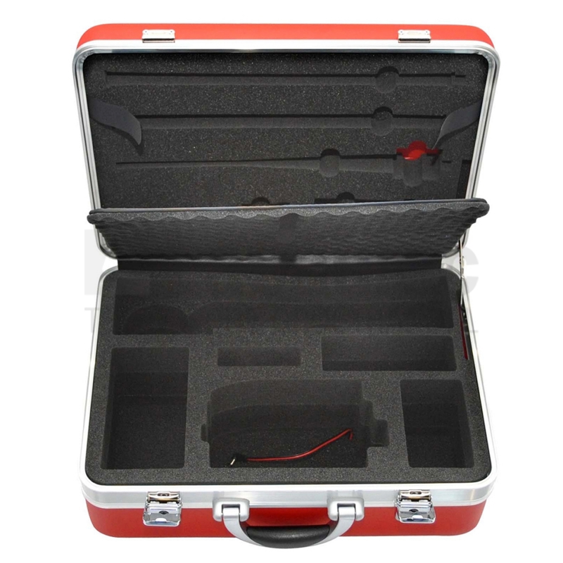 De koffer is voorzien van een op maat gefreesd schuiminzetstuk dat specifiek is afgestemd op de Hunter of Goliath apparatuur plus accessoires zoals sondes en laders.