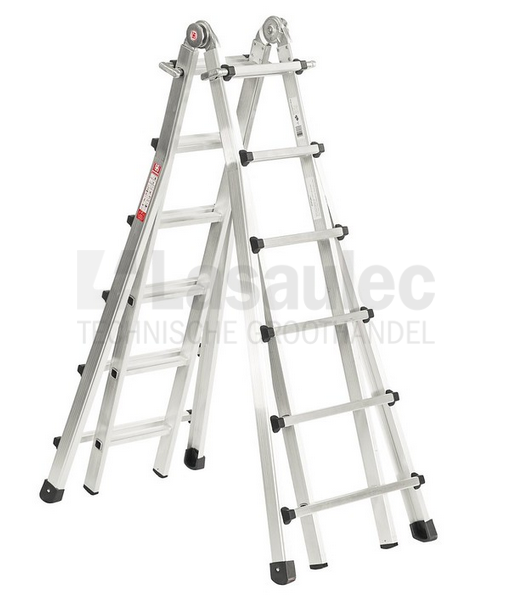 Professionele Telescoopladder voorzien van staanders in geëxtrudeerde aluminiumprofielen met mechanisch versterkte geribde inkepingen en geëxtrudeerde treden met verstevigde profielen voor een betere anti-slip.