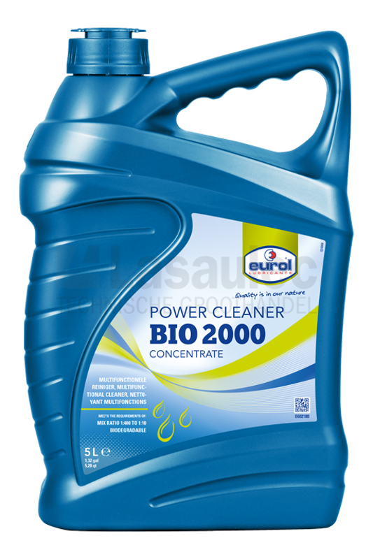 Eurol Power Cleaner Bio 2000 is een sterk geconcentreerd reinigingsmiddel met een zeer grote reinigingskracht voor een breed toepassingsgebied. Het is uitermate geschikt voor het reinigen van harde ondergronden zoals metaal, lak, kunststof, etc. Het is buitengewoon geschikt voor het reinigen van motorfietsen, motoren, motorcompartimenten, race-, cross- en toerfietsen, wanden, vloeren en scheepdekken, tuinmeubilair, caravans etc. Na het opbrengen goed in laten trekken en afspoelen of afspuiten met veel water. Indien gebruikt voor vloeren, ook nadrogen met een dweil om gladheid te voorkomen. Goed biologisch afbreekbaar - Niet giftig en fosfaatvrij - Waterdunne onbrandbare vloeistof Afhankelijk van de vervuiling wordt een dosering van 1:400 tot 1:10 aanbevolen. Bij zeer sterke vervuiling is Eurol Power Cleaner Bio 2000 ook onverdund te gebruiken.VORSTVRIJ OPSLAAN.