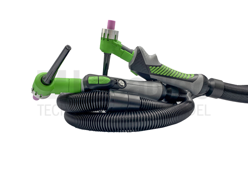 De 8TE TIG-toorts is voorzien van toortsafzuiging waardoor tot 95% van de schadelijke lasrook wordt afgezogen.