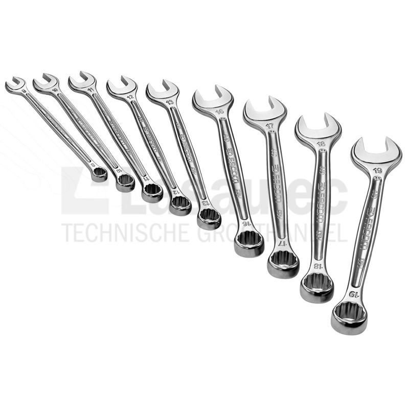 Steekringsleutelset, 9-delig, voorzien van sleutels met hoogwaardige mechanische eigenschappen gecombineerd met geringe afmetingen, met oog voor de eisen die de luchtvaart stelt. Door het ontwerp van de hoek van de ring krijgt men meer vat op achter elkaar geplaatste of verzonken moeren, het 12-kants OGV profiel geeft een krachtig koppel, zonder de moer te beschadigen, hoek: 15 gr. Geoptimaliseerde geometrische verhouding tussen de vork en steel voor meer toegankelijkheid en geslepen vorkbladen.