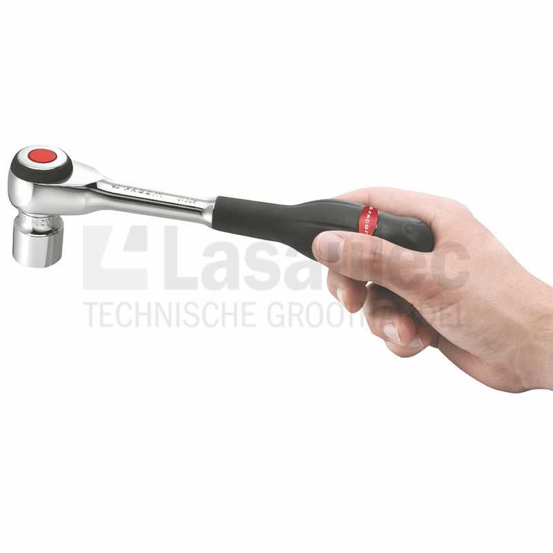 Ratel voorzien van 3/8" aandrijving, vergrendelingssysteem door op de rode vergrendelingsknop te drukken komt de dop los van het aansluitstuk, draaiend handvat ideaal voor werk in kleine ruimtes, ideaal voor moeilijk bereikbare en/of zichtbare plekken, omdat één hand vrij blijft, bestaat er minder gevaar voor letsel of krassen, ligt goed in de hand en brengt het aanhaalmoment beter over en bespaart dus tijd.