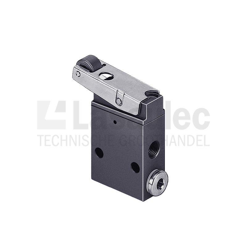 Festo ventiel vervaardigd uit geanodiseerd aluminium, voorzien van roller bediende hendel.