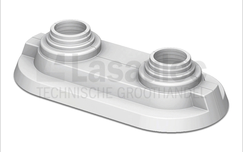 Dubbele buisrozet voorzien van klemlippen, vervaardigd uit polypropyleen.
