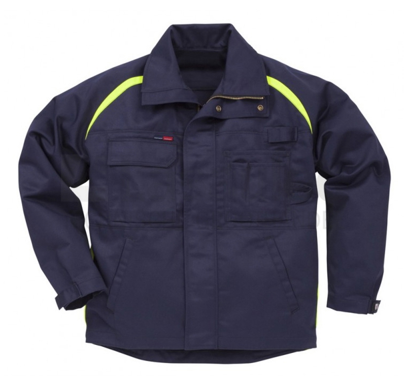 Werkjas vlamvertragende voorzien van rits en knopen tot boven in de kraag.
