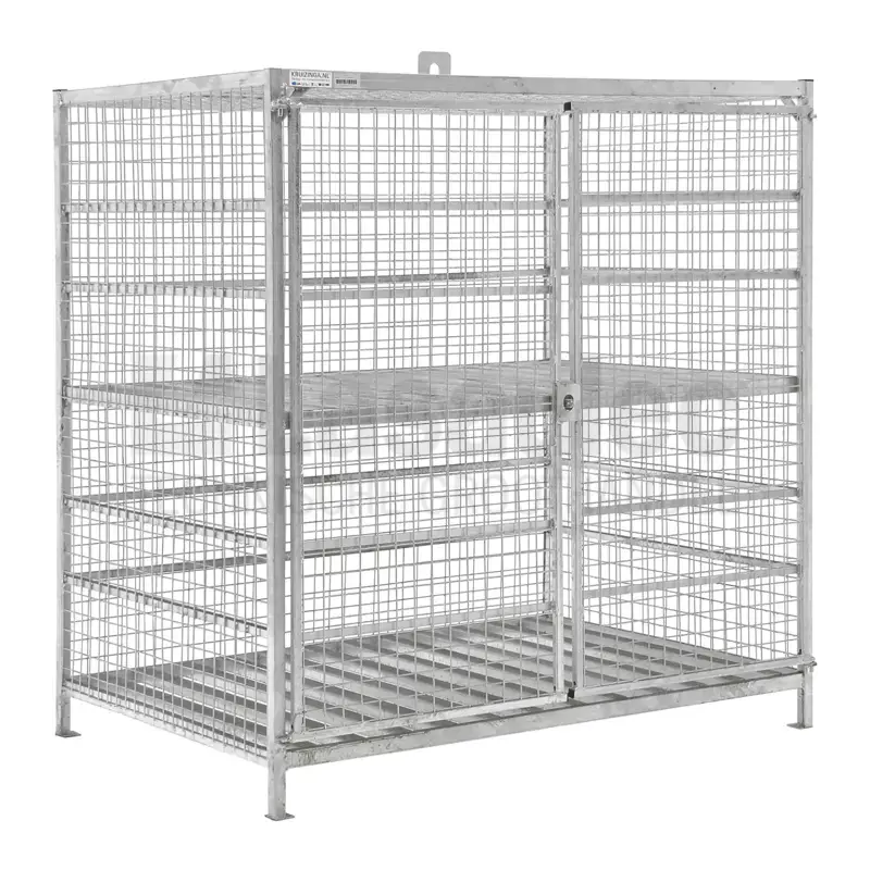 Thermisch verzinkte stalen opbergkast. Deze opbergkooi biedt plaats aan gasflessen op 2 etages. De draadgaas deuren en wanden zorgen voor voldoende ventilatie en door de vier pootjes is de kast ook gemakkelijk op te pakken met een heftruck of palletwagen. De twee vleugeldeuren zijn af te sluiten met een optioneel hangslot.