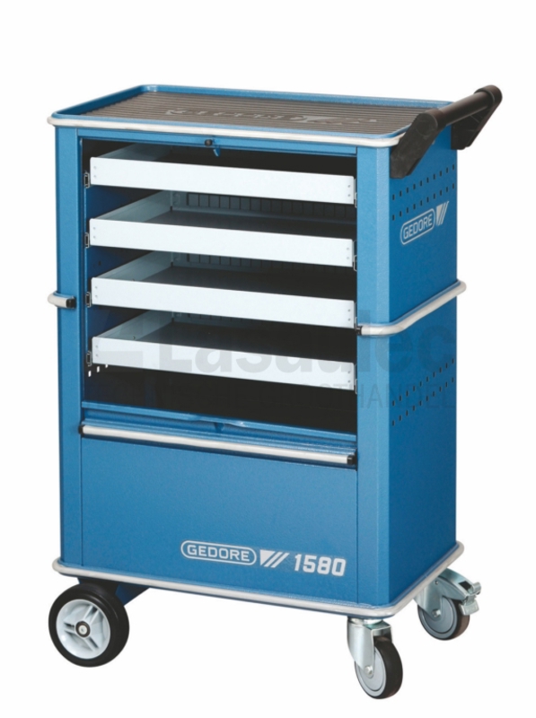 • GEDORE onderstel met rolgelagerde hoogwaardige wielen met elk 2 bokwielen Ø 140 mm en zwenkwielen Ø 100 mm, waarvan één met rij- en zwenkblokkering