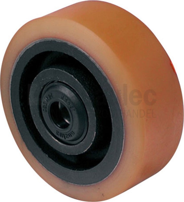 Gietijzeren wiel met een opgevulcaniseerde Vulkollan band (92° Shore A) met twee diepgroefkogellagers.