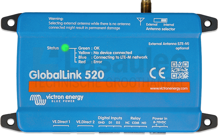 De GlobalLink 520 heeft twee communicatiepoorten, die toelaten tot twee VE.Direct-apparaten, zoals een BMV Battery Monitor en/of een MPPT PV-laadregelaar, rechtstreeks met VRM te verbinden. Compatibele Victron Smart-producten kunnen via BLE verbonden worden. Met twee digitale ingangen die ook werken als pulstellers en een remote regelbaar relais is het een perfecte oplossing om je installatie te controleren en regelen.