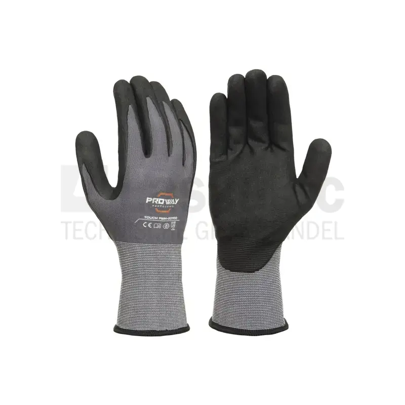 De Proway PWH-80700 is een werkhandschoen uit de Touch Serie. Handschoenen in de Touch Serie voldoen aan de hoogste kwaliteitseisen. De PWH-80700 heeft een 15G naadloos gebreide liner van Nylon/Spandex. Een liner van nylon/spandex is elastisch en toch sterk. Nylon is elastisch en licht. Nylon biedt goede dexterity en is slijtvast. Spandex heeft een hoog ademend vermogen en heeft een hoge schuurweerstand. De PWH-80700 is voorzien van een nitril handpalm coating. Een nitril coating is flexibel en biedt goede bescherming tegen schuren. Een nitril coating bevat geen latex wat de kans op allergische reacties verkleint. Een nitril coating beschermt in zekere mate tegen zuren en olie. Deze handschoen is uitermate geschikt voor assemblage, auto-industrie, installatietechniek, montage en onderhoud, precisie werkzaamheden, racing en automotive, retail (DIY), schilderwerk, verf en spuiterij.