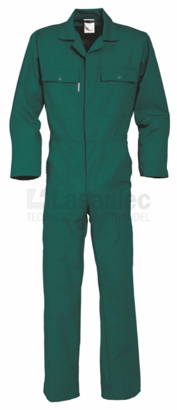 Overall voorzien van een verdekte drukknoopsluiting, 2 zijzakken, 2 intasten, 2 borstzakken met klep, achterzak, duimstokzak, elastiek in rug en rugplooien.