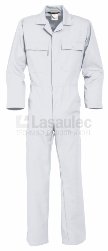 Overall voorzien van een verdekte drukknoopsluiting, 2 zijzakken, 2 intasten, 2 borstzakken met klep, achterzak, duimstokzak, elastiek in rug en rugplooien.