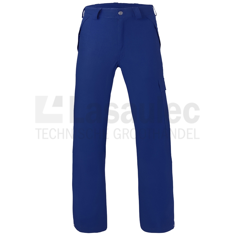 Vlamvertragende en antistatische werkbroek voorzien van verdekte ritssluiting, 2 ingezette zijzakken met klep, achterzak met klep, duimstokzak, dijbeenzak met klep, elastiek in rug en pijpen met steldrukkers.