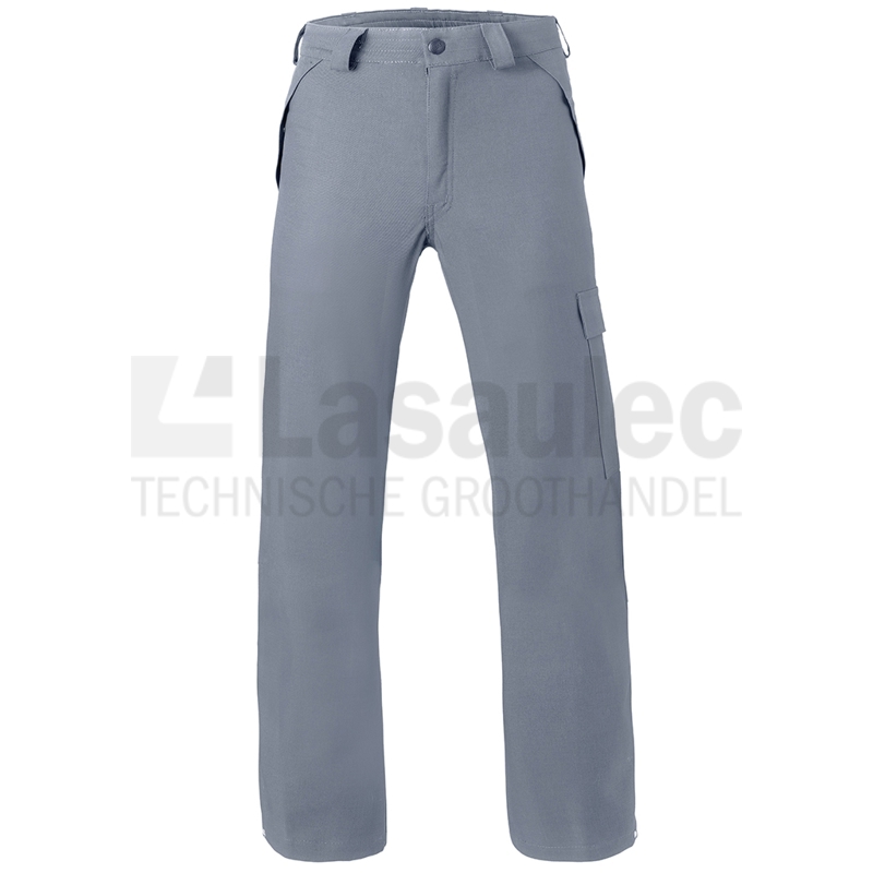 Vlamvertragende en antistatische werkbroek voorzien van verdekte ritssluiting, 2 ingezette zijzakken met klep, achterzak met klep, duimstokzak, dijbeenzak met klep, elastiek in rug en pijpen met steldrukkers.