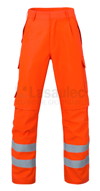 Werkbroek in Hi-Vis, vlamvertragend en antistatisch, voorzien van verdekte ritssluiting, 2 ingezette zijzakken, achterzak met klep, duimstokzak met klep, dijbeenzak met klep, voorgevormde makkelijk toegankelijke kniezakken met opening aan bovenzijde afsluitbaar met klep en klittenband, lengtezoom en RWS striping.