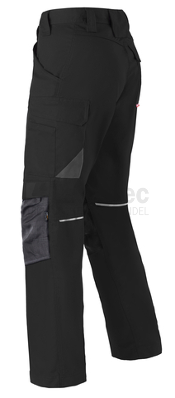 Werkbroek voorzien van verdekte ritssluiting, dijbeenzak met verdekte drukknoopsluiting, 2 ingezette zijzakken, duimstokzak met rolmaatzakje, verstelbare elastiek in taille, Cordura® kniezakken, 1 achterzak met verdekte drukknoopsluiting, reflecterende piping, D-ring en extra inzet bij kruis ter voorkoming van uitscheuring.