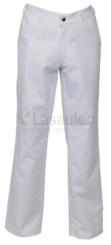 Werkbroek voorzien van een ritssluiting, 2 ingezette zijzakken, 2 achterzakken waarvan 1 met knoop, duimstokzak en elastiek in rug .